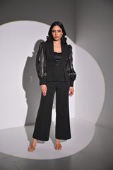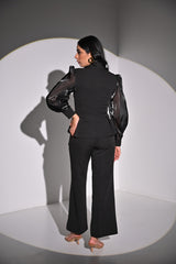 This exquisite Anna blazer is crafted from premium quality banana crepe fabric and features a peplum style with sheer sleeve detail, designed to accentuate your figure. With its single button closure and impeccable tailoring, this blazer exudes confidence and sophistication. The neatly finished lapel and cuff add a touch of elegance to the overall design, making it a wardrobe essential for any fashion-forward individual.