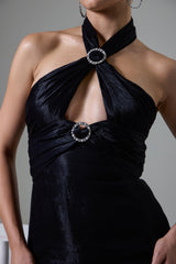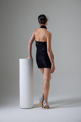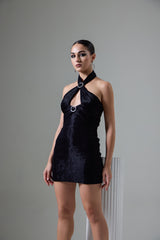 This stylish short dress showcases exquisite pin tuck detailing for a textured look. The eye-catching rings on the neckline add a unique twist, while the deep back offers a sultry finish. With its interesting neck design, this dress effortlessly combines elegance and modern flair, making it a standout choice for any occasion.