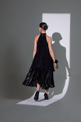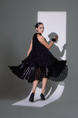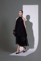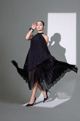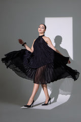This exquisite double-layer dress blends luxurious sheesha crepe with airy jimmy organza for a striking look. Crafted with plisse fabrics, it drapes beautifully, allowing for graceful movement. The elegant choker neck adds sophistication, making this dress a perfect choice for special events where you want to make a lasting impression.