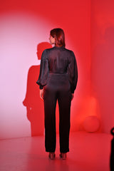 You'll love this stylish and comfortable jumpsuit with its stunning bishop sleeves, V-neck, and hand-embellished sequin panel accentuating the neck on luxurious satin fabric. It's a true standout piece that's sure to turn heads.