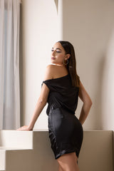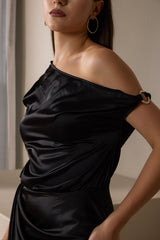 Introducing our stunning short dress featuring a captivating one-shoulder design that exudes modern elegance. Crafted from luxurious satin, this dress drapes beautifully, enhancing your silhouette with a touch of glamour. A glimmering ring adorns the off-shoulder, adding a unique focal point that elevates the overall look. The standout long satin panel cascades gracefully, providing a sense of movement and sophistication. Perfect for a night out or special occasion, this dress effortlessly combines style and allure, ensuring you make a memorable entrance wherever you go.