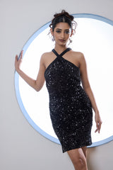 Transform your evening look with this stunning short sequined tube dress, designed to shine with every step. The all-over sequins create a radiant effect that catches the light beautifully. With a daring deep back that adds a touch of allure, this dress is both chic and sophisticated. The unique embroidered straps provide an eye-catching detail, adding texture and interest to the overall design. Perfect for parties or special occasions, this dress ensures you’ll turn heads wherever you go.