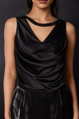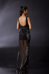Elevate your style with our exquisite Armani satin dress featuring chic shorts, designed for the modern fashionista. The stunning cowl neckline adds a touch of sophistication, while the deep V back showcases elegant embroidery that brings a unique flair to the design. An embroidered strip accentuates the collar line, adding a delicate detail that catches the eye. Flowing gracefully from the waist to floor length, the long Jimmy organza overlay creates an ethereal effect, blending playful and refined elements effortlessly. Perfect for special occasions, this dress is a beautiful combination of comfort and high fashion.