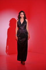 Our Angeline dress features a cowl neck that drapes gracefully, creating soft folds that frame the neckline and draw attention to the collarbones and shoulders. Made with lurex fabric that sparkles delicately, casting a mesmerizing shimmer as you move. It's not overly flashy but instead adds just the right amount of sparkle to elevate the ensemble. The maxi length elongates the silhouette, creating a statuesque presence that commands attention.