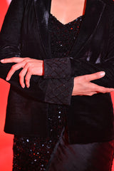 This strappy dress features intricate hand-embellished sequins adorning the overlapping upper velvet panels. Each sequin is carefully placed and sewn by skilled artisans, creating a dazzling display of sparkle and shine. The sequins catch the light from every angle, casting a radiant glow as you move.  The lower panel is made with satin fabric with pleat detailing. The satin fabric is smooth and lustrous, contrasting beautifully with the rich texture of the velvet. The pleats add a touch of sophistication and movement to the lower half of the dress, creating an elegant silhouette that skims over your curves.