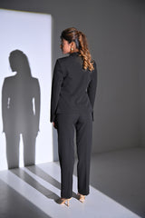 A sleek and stylish blazer and pants set, tailored to perfection, with an air of sophistication that commands attention. The fabric is smooth and exudes a subtle sheen under the light, highlighting its high quality. However, what truly sets this blazer apart is its lapels, which are adorned with intricate hand embellishments using cut daana and stone. Each stitch tells a story of craftsmanship and elegance. The pants are super stylish and comfortable, and both pieces are made of banana crepe fabric.