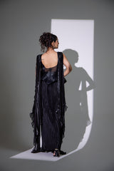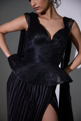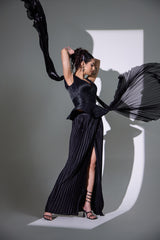 This stylish ensemble features a corded blouse with elegantly draped panels, creating a flattering silhouette. The peplum hem adds a touch of flair, while the drape plisse skirt in soft georgette flows effortlessly with every step. Complemented by two delicate drapes on the shoulders made of luxurious jimmy organza, this outfit exudes sophistication and charm, perfect for any chic occasion.